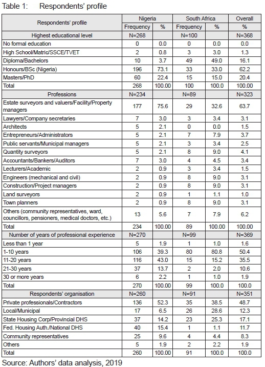 A purposive sampling approach, following Naoum (2007), was employed with the sampling frame drawn from professionals and other stakeholders in the human settlement/housing sector in Nigeria and South Africa. The contact details of the respondents were obtained from the various professional bodies (Nigeria Institution of Estate Surveyors and Valuers, South African Property Owners Association [SAPOA], various government organs involved in Human Settlements/ Housing (Department of Human Settlements, Ministry of Housing and the Various Housing authorities) and some residents' associations. The respondents were encouraged to snowball the survey to other willing and relevant participants.
