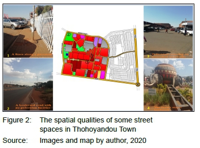 Louis Trichardt was established as a well-planned town for the White minority under the Town Planning Ordinance (No. 17 of 1939 and No. 15 of 1986). Louis Trichardt Town is characterised by large-scale commercial farming environment. The town has more expansive street spaces compared to Musina and Thohoyandou. These three small towns may all be in the same district municipality, but they have different cultural, economic, and politico-historical backgrounds and characters. It is thus likely that the users have different experiences of street spatial qualities and their 'right to the city' in the three towns. Figure 4 is a land-use map of Louis Trichardt Town in relation to the spatial qualities of street design and management.
