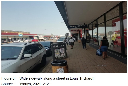 In Table 3, more dissatisfaction with the quality accessibility as a measure of spatial justice on street spaces was highlighted in responses from Thohoyandou Town compared to the other two towns. This is attributed to inadequate sidewalk widths, following the stance taken by the municipality to be more accommodative of vehicles through the 2011 Urban Regeneration Programme. This aligns with arguments by Soja (2010: 8, 31) and Van Wyk (2015: 31) who state that processes of producing urban [street] spaces are sometimes responsible for (re)creating spatial injustices. From observation of the streets in Musina Town, the accessibility challenge was not due to a lack of adequate sidewalks per se, but to the obstructions of sidewalks by other activities such as street trading and illegal parking. In Louis Trichardt Town, the vendors and pedestrians were generally satisfied with the accessibility of street spaces, because the town was designed with wide sidewalks of over the recommended minimum width of 1.2m (DHS, 2019: 247). Figure 6 shows that users in Louis Trichardt enjoy the ease of mobility on sidewalks due to their width sizes. This gives users the right to access, which is a form of spatial justice (Middleton, 2018: 302).