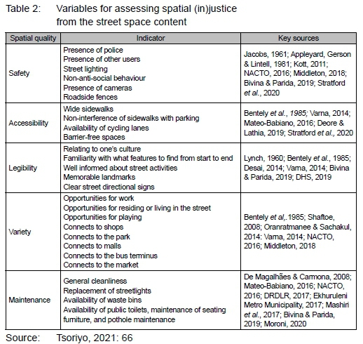 Street design is "an act of shaping or planning the urban environment", which entails transforming "abstract spaces to humanised places" (Carmona et al. 2003: 14). Street management entails the redress of all the malfunctions (spatial injustices) that may occur in the use of streets and that may cause potential threats to the 'right to the city' and quality of urban dwellers (De Magalhães & Carmona, 2008: 112; Mehta, 2018: 16, Stratford et al., 2020: 125), as users interact on street spaces daily (Middleton, 2018; Moroni, 2020). The processes of street design and management produce various socio-spatial dimensions or spatial qualities on street spaces such as safety, accessibility, legibility, variety, maintenance or vital infrastructure, and service (Shaftoe, 2008: 47; Mateo-Babiano, 2016: 110; Deore & Lathia, 2019: 139; Bivina & Parida, 2019: 4940; Stratford et al., 2020: 127). The spatial qualities translate to various 'right to the city' claims to which users are entitled on street spaces. For example, street users have the right to safe and secure street spaces or the right to accessible space (Brown & Kristiansen, 2009: 193; Marcuse, 2009: 193).