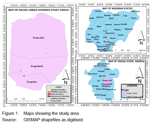 Residential land uses in Enugu City consist of formal and informal areas. Ogbete layout was the oldest neighbourhood area in Enugu. It served as a place of residence for the coal workers. Other residential layouts that were built later include the Government Reservation Area (GRA) for colonial masters and China Town for railway workers, and later Ogui layout and Uwani for other migrants to the city. The continuous migration of people in search of greener pastures in the city gave rise to other residential land-use developments, as witnessed nowadays, such as Achara Layout, Maryland, Trans-Ekulu, Independence Layout, New haven, Uwani, among others. The informal residential areas in Enugu City are found in the city core, intermediate and the peripheral of the city. Those at the peripheral are found on the outskirts of the local government areas (Enugu South, Enugu North and Enugu East (see Figure 1) making up the city of Enugu; Ugboghe, Ugbo Ezeji, Ikirike Campus 1, Iva Valley Pottery as examples). Moreover, there is a minor or small number of informal settlements at the core and intermediate zones of the city, which includes Onu-Asata, Ngenevu, and Obiagu. However, the areas of the study within Enugu City include Ugboghe, Ngenevu, Ikirike Campus 1, Iva Valley Pottery, and Akpumkpirishi.