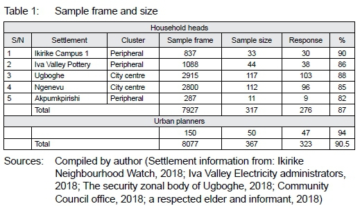 To obtain the informal settlements population, data from Town Planning Authorities was reviewed to get an estimate of 28 informal settlements in Enugu City and its peripheral areas. Applying cluster sampling technique, the informal settlements clustered into two; those at the urban centre/intermediate zones (with 11 informal settlements) and those at the urban peripheral (with 17 informal settlements). From these clusters, five informal settlements were selected in the ratio of 2:3 for settlements at the city centre/ intermediate zone (Ngenevu and Ugboghe) and those at the peripheral (Ikirike Campus 1, Akpumkpirishi and Iva Valley Pottery), respectively. There are 7 927 households living in the five informal settlements (see Table 1). From these, stratified sampling (Kusi, 2012: 61) was used to select 317 household heads (see Table 1) to participate in the survey. Purposive sampling (Rai & Thapa, 2015: 6) was used to select 50 urban planners from the 150 listed by the Nigerian Institute of Town Planners, Enugu State Chapter.