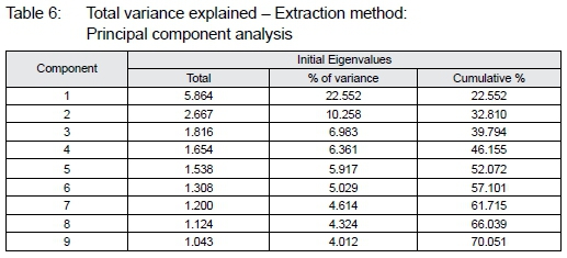 The Kaiser-MeyerOlkin (KMO) value of 0.794 was obtained, which is greater than 0.70, and Bartlett's test of Sphericity has the significant value of (p<0.05) at 5% level of significance, as shown in Table 5. Therefore, the results obtained indicate that the data is robust and suitable for conducting factor analysis in line with Pallant (2013).