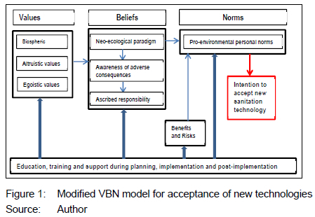 The model shows that biospheric (belief that it is worth protecting nature because otits intrinsic value), altruistic (dealing) with the welfare ot others), and egοistic (concerned with one's own welfare) values play a part in shaping thp beliefs of would-be technology users. These valups affect subsequent b eliefs, including the new ecological paradigm that represents people's belief in the extent to which they can affect nature (Poortvliet et al., 2018: 91-92; Ssemugabo et al., 2020: 227), followed by people's awareness of adverse consequences of their course of action. The beliefs, in turn, affect the norms that affect or control the final intention to accept the new sanitation. The model is modified to include risks and benefits that affect the norms, separately from the beliefs and values. Appropriate on-going education and training, which reshape the biospheric, altruistic, and egoistic values can serve to affect or influence the intention to accept the new sanitation. Creating an awareness of the benefits of the new technology when compared to the risks can also serve to re-shape the norms of intended users and hence, influence their intention to accept the new sanitation. The re-shaping process spans all three stages of the sanitation technology roll-out.