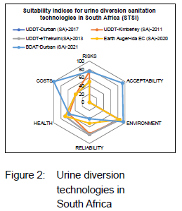 Urine diversion dry technologies contribute greatly to water conservation. Figure 2 shows that sanitation technologies that have been in use in South Africa, but utilise the UDDT technology, have low user-acceptance levels (low mean acceptability, according to Table 10). This is mainly due to low technical and user interface acceptability. The exception is with the BDAT, which, when tested in field trials, showed good acceptance (Sutherland et al., 2020: 10). However, it was only tried with one family in Durban. Similar patterns of good scores and acceptance (except for reliability scores) were obtained with the BDT in Uganda when tested publicly against many users during a field trial survey (Tobias et al., 2017: 270-271). Therefore, conducting field trials and surveys to re-design or modify sanitation technologies according to user preferences seems to improve STUA.