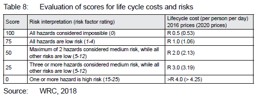 To arrive at the risk scores, the risk factor ratings are calculated by multiplying the ris k likelihood by the risk severity (from Tables 3 and 4). The figure obtained is used together with the risk interpretations to arrive at the risk score. The life cycle cost score is obtained by first evaluating the life cycle cost per person per day and then reading it against the "score" colu mn in Table 8. If the score is not exactly equal to the life cycle cost per person per day in Table 8, then interpolation is used to obtain its exact corresponding value under the "score" column.