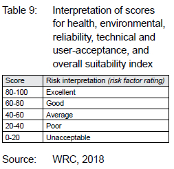 For example, in the Earth Auger technology survey conducted by Mlamla and Mbanga (2020: 6-7), 97% of the beneficiaries of the technology decided not to use it. Some of the underlying reasons were poor construction (50%), poor hygiene (10%), and incompatibility with the disabled and the elderly (12%). The users thus assumed the technology to be of a lower standard. This item also affects the reliability of the technology because poor construction may also imply parts that easily break and hence, are not reliable (Mkhize et al., 2017: 117; Mlamla & Mbanga, 2020: 7). The users do not reuse the waste as fertilizer, thus an indicator of lack of proper education and awareness of these benefits. Hence, it is disposed of to landfill. Because it poses a danger to the elderly and the disabled, this information must be appropriately captured in the risk scorecard. The other information is technical and is inherent in the way in which the technology was designed. This includes suitability of ground conditions for the technology and ability for it to be placed close to people's homes. Roughly 92% of would-be users who had used a waterborne toilet previously, preferred a waterborne toilet to a UDDT (Matsebe, 2011: 66). This same pattern was also evident in the Ida Community, in the Eastern cape. Once all information is filled in, the final score was generated according to the WRC guidelines (2018: 60-71).