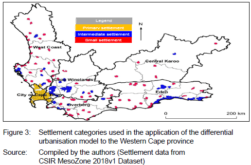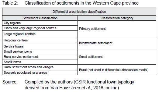 According to the differential urbanisation model, settlements are classified as either primary, intermediate, or small settlements. However, the model does not give guidance in defining these settlement typologies. To this end, the study used a modification of the 2018 CSIR functional town typology to classify settlements in the Western Cape. Although the 2018 CSIR functional town classification system has 10 types, these have been translated into three settlement categories to simplify analysis and align with the common tri-class form of the differential urbanisation model, and to the settlement categorisation used by the IUDF (RSA, 2016). The interpretation of the CSIR functional town classification system is captured in Table 2. Figure 3 depicts a map showing the spatial distribution of the subsequent classification of settlements.