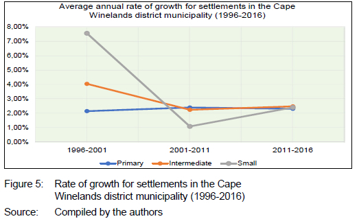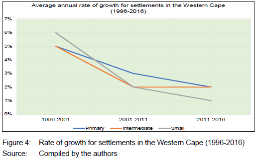 In comparing the settlement categories, the greatest change in growth rates for the period 1996 to 2016 was experienced in the small settlements (4.29%). This is expected, given the larger number of settlements and the smaller population sizes in the small settlement category relative to the other categories. Relatively small changes in population size will have a greater statistical impact in the small settlement category than in the other categories. It is interesting to note that the primary settlement (namely, the Cape Town Metro) had a higher growth rate for the period relative to the intermediate settlements, a reflection of the urban centre's importance as a locus of urbanisation in the province.