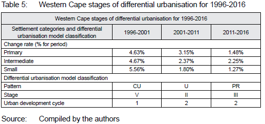 Between 1996 and 2001, the Western Cape urban system experienced a counter-urbanisation phase, where the rate of growth of small settlements (5.56%) was higher than that of the primary (4.63%) and intermediate settlements (4.67%). During this period, intermediate settlements had a higher growth rate than the primary settlements, which classifies the urban system during the period as being in the early small city stage (Phase V).