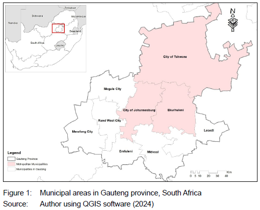 This study focused on Gauteng province in South Africa. The province comprises three metropolitan cities, Ekurhuleni, Johannesburg, and Tshwane, and 6 local municipalities: Mogale City, Rand West City, Merafong City, Emfuleni, Midvaal, Lesedi (see Figure 1). According to the census data released in 2023, Johannesburg's annual compound growth trend is 0.7%, while it is 3% in Tshwane. Emfuleni, a historically low-growth municipality, has realised a population growth of 31% since the last census (Götz et al., 2023; StatsSA, 2023). Gauteng has grown by nearly a quarter (23%) of its own previously measured population size of 12.7 million and now houses some 15.1 million people over the past decade (Götz et al., 2023). Although the province only covers 1.5% of South Africa's total land area, it is considered the country's economic heartland and a gateway to Africa (Dlamini & Tesfamichael, 2021). There have been marked shifts in the racial composition of the Gauteng population: Black African, 84,6%; Coloured, 2,9%; Indian, 2,2%; White, 10,0%, and other 0,2% (StatsSA, 2023). The percentage of the population born in Gauteng increased from 56% in 2011 to 64.7% in 2022, while Gauteng's migrant population makes up 35.3% of the province's people (Götz et al., 2023).