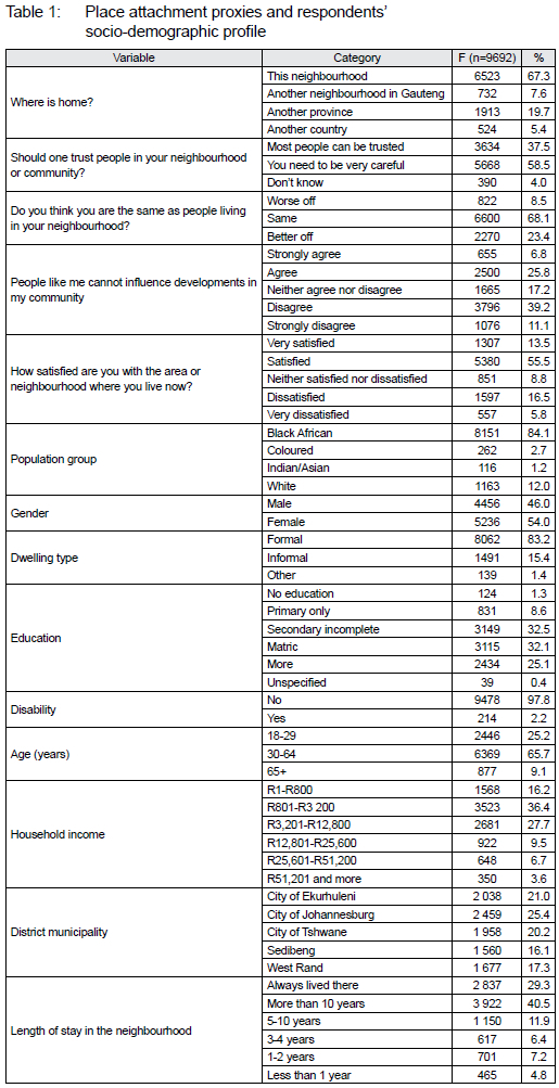 This study used secondary data obtained from the Gauteng CityRegion Observatory (GCRO) Quality of Life (QoL) survey. The study is the sixth iteration, conducted biennially in Gauteng province. The research adopts a quantitative approach to explore the nexus between place attachment and community participation in community-driven programmes in Gauteng province, South Africa. From the QoL survey dataset, descriptive and inferential data analysis (Creswell, 2014) was done. This study used socio-psychological data to cluster participants in four 'place-attachment' social groups, after which a combined index of participation was calculated. Inferential analyses were used to show the significant differences in participation in community-driven development among the four social groups.