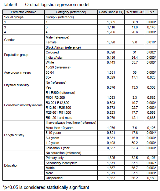 This selection was influenced by comparable empirical studies on place attachment (Manzo & Perkins 2006; Raymond et al., 2010; Anton & Lawrence, 2014; Jordaan, 2015; Dlamini & Tesfamichael, 2021; Lu et al., 2023). Socio-demographic data from the QoL survey, including the population group, age, sex, income, dwelling type, highest educational level, one's physical ability status, district municipality and length of stay in the neighbourhood, were control factors used to assess the odds of participation.