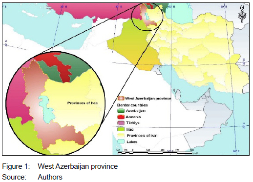 West Azerbaijan province in northwestern Iran covers 37,412km2, making up 2.65% of the country's land area, ranking 11th in size. It shares approximately 16% of Iran's total land borders with neighbouring nations, including Nakhichevan Autonomous Republic and Turkey to the north, East Azerbaijan province to the east, Kurdistan province to the south, and Turkey and Iraq to the west. Notably, it is the sole Iranian province bordering three foreign countries, granting it a unique geopolitical standing. The province has a total border length of 888km, with the longest land border of roughly 518km along the northern and western frontiers shared with Turkey, and the shortest being approximately 131km along the northern water border adjacent to the Aras River and Nakhichevan Autonomous Republic (Nazarnejad, Shahhossein & Asadzadeh, 2018). West Azerbaijan was chosen as the study area, due to its proximity to Russia, Azerbaijan, Turkey, Armenia, and Iraq, all of which have historical connections to Iran. These countries share elements of Iranian culture and history, and the international and Russian policies towards neighbouring countries have presented challenges and transborder issues. Furthermore, the province has a 239km land border with Iraq to the west, as depicted in Figure 1.