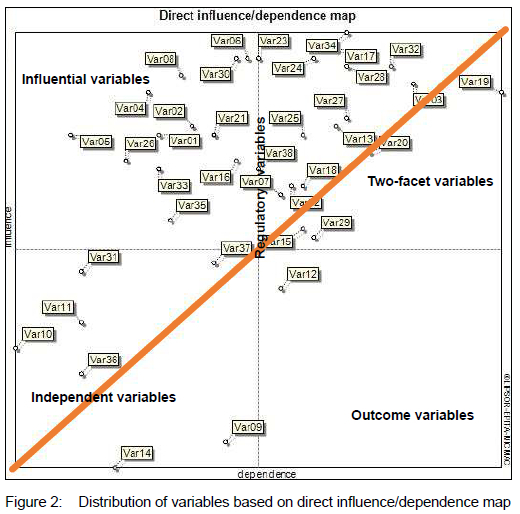 Figure 2 shows the classification of the initial items affecting sustainable development and security of border areas, classified according to their location in the influence/dependence map of the variables. The results show that the majority of the factors link to the influential variables (simultaneously have a very high influence and dependence) and two-facet variables (have a high influence and high dependence) quadrants.