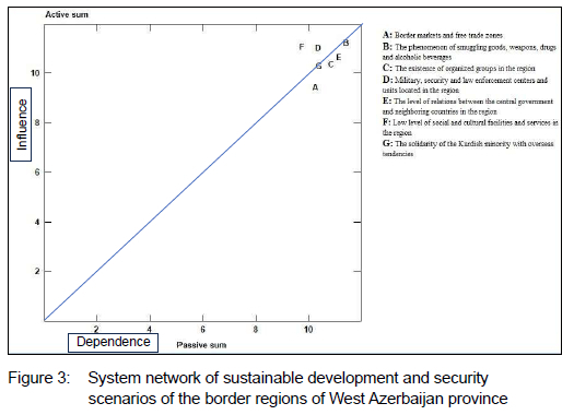 Table 4 shows the ranking of the ratings from the cross-impact analysis done with MicMac software on how the initial factors had a direct/indirect influence and impact on each other. The items with the highest score had the most influence on the realisation of border security and sustainable development of the border areas in West Azerbaijan province.