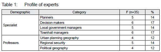 Delphi sample sizes depend more on group dynamics in reaching consensus than on their statistical power (Kheradranjbar, Mohammadi & Rafiee, 2022). A non-probability snowball sampling method was used to assemble the expert panel, with initial experts recommending the participation of their peers (Kamanroodi & Jafarpour Ghalehteimouri, 2020). Delphi panel members were introduced from planning specialists and prominent university professors in the field of regional development, sustainable security, and border areas. Finally, 35 experts were invited to participate in the Delphi survey. In the Delphi process, general rules of thumb indicate that 14-30 people for a homogeneous population (that is, experts coming from the same discipline such as, for example, planning specialists) are generally considered to be sufficient to achieve consensus (Kheradranjbar et al., 2022) (Table 1).