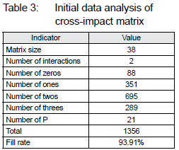 Table 3 shows the cross-impact results from MicMac software; the matrix displayed a filling rate of 93.90%, indicating a substantial influence between the initial factors. Within the total of 1,444 assessable relationships in this matrix, 88 relationships had a value of zero, signifying no mutual influence between those specific factors. On the other hand, 351 relationships had a value of one, suggesting a limited influence. Moreover, 695 relationships had a value of two, indicating relatively robust interrelations between the factors. In addition, 289 relationships had a value of three, denoting that these key factors had highly significant and profound influence on each other. Lastly, there were 21 relationships with a value of P, signifying potential and indirect relationships between the factors.