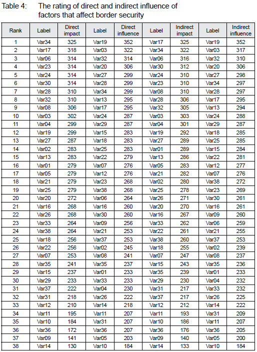 In the cross matrix (Table 4), the sum of the row numbers of each variable that shows the degree of influence and the column sum of each variable that also shows the degree of influence of that variable from other variables were used to identify the key factors affecting border security.