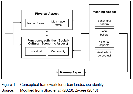 In this study, urban landscape identity is the residents' opinions and perceptions of the special features that help them differentiate between places, by creating images they can recognise. It encompasses the forms/physical aspects, functions/ activities (sociocultural aspects), and meaning aspects. All three aspects combine to create individual and collective memories for the residents (K'oyoo & Breed, 2023, modified from Shao et al., 2020). Figure 1 shows the conceptual framework for urban landscape identity and its link to urban memory within the urban landscape.