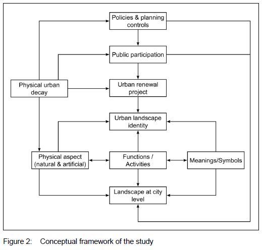 The findings of this article are anchored on the concepts of 'urban renewal', 'urban landscape identity', and 'public participation' that should not be viewed as separate entities in city-upgrading projects. Landscape identity within the urban landscape needs to be critically considered during urban renewal projects in a city. There is a need for public participation during the planning process and implementation of urban renewal projects that result in changes to previously existing urban forms, thereby affecting urban landscape identity within the urban realm. How public participation takes place and what is done with the findings are critical for an urban renewal project to be successful. Figure 2 represents the conceptual framework of the study.