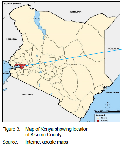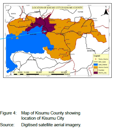 The study was conducted in Kisumu City, the third largest urban area in Kenya (see Figures 3 and 4). Kisumu City is the main administrative centre and headquarters of Kisumu County and is located at 265km north-west of Nairobi. It lies on the eastern shores of Lake Victoria, the continent's largest fresh-water lake, and is 1,146 metres above sea level and located 0o 6' south of the Equator and 34o45' east (AFD, 2013). In 2022, the city covered an area of 417km2 (157km2 of water and 260km2of land), with a population estimated at over 500,000 people. According to KNBS (2019:20), on Kenya's population and housing census 2019, the study area (Kisumu town area and its outskirts) falls within Kisumu Central Sub County that has a total population of 174,145 people, consisting of 84,155 males (48.3%), 89,985 females (51.7%), and 52,331 households. The Kisumu town area has a total population of 56,498 people and 17,258 households within a land area of 25.4km2. Sub-locations within the Kisumu town area include Kaloleni, Bandari, Southern, Northern, and Kanyakwar.