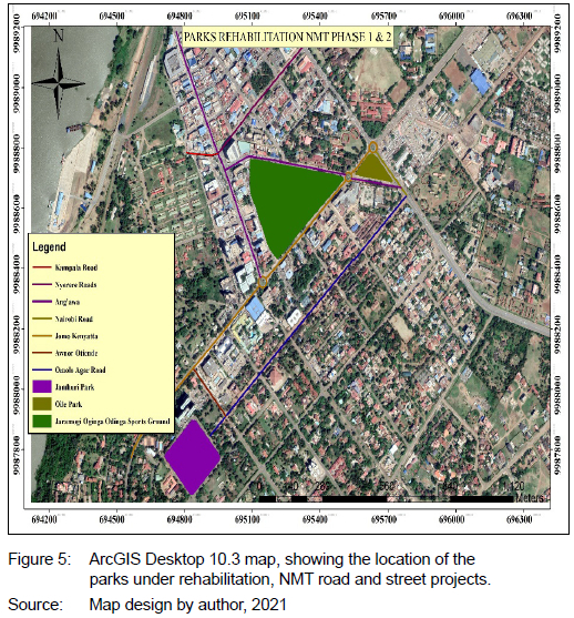 Mapping was done for the locations of the various sites of interest and the sites undergoing urban renewal. Figure 5 shows the various parks within the CBD that were undergoing rehabilitation, due to urban renewal mapped using ArcGIS software after picking the location coordinates during field investigation. This was important in understanding the ongoing and completed activities within the city that could impact on changes in urban landscape identity. The study greatly relied on the map of Kisumu's sites of interest (Figure 6) (CoK KUP, 2019).
