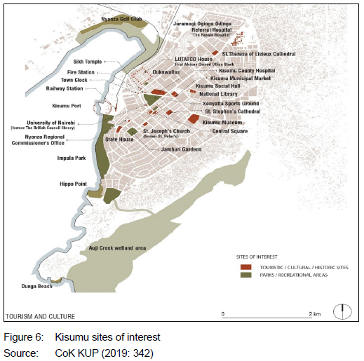 According to the City of Kisumu's Kisumu Urban Project (2019), Kisumu's sites of interest include parks such as Jomo Kenyatta Sports Ground, monuments such as the Clock Tower, religious buildings such as St Theresa's Catholic Church, the Sikh Building, government buildings such as the old provincial headquarters, the railway station, the Kisumu port, the fire station, educational buildings such as the University of Nairobi building, Kisumu proposed historic and heritage core area consisting of old Asian architecture, the Jaramogi Oginga Odinga Teaching and Referral Hospital, the Kisumu social hall, and the Kenya National Library Services building, among others. Figure 6 indicates the sites of interest that were identified after doing a situational analysis in 2019 by Kisumu City.