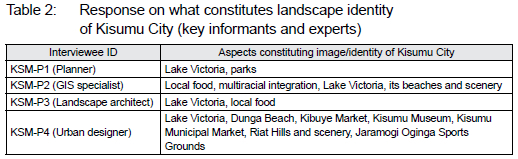 The professionals/experts were asked about the physical, sociocultural, economic, and meanings aspects that constituted the image/character of Kisumu and formed its urban landscape identity. The findings revealed that Lake Victoria and public parks were mentioned by all as an aspect of the natural environment. The sociocultural factor is in terms of multi-racial integration of different races within the city in terms of Africans and Asians as permanent residents. The local food had a meaning aspect for individuals and groups in terms of individual/personal memory and social/collective memory. Staple food in terms of 'ugali' and fish from Lake Victoria are the locals' favourite food and constitute part of the city image and local identity. Public buildings such as the Municipal Market, from colonial days prior to independence, are part of the physical aspects of the city image and resultant urban landscape identity. Table 2 presents the results.