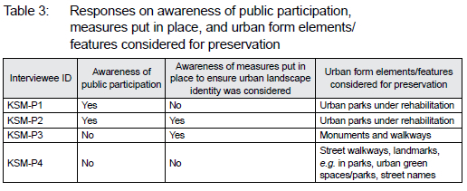 The professionals were interviewed about the ongoing and completed urban renewal projects in terms of their awareness of public participation, awareness of the measures put in place to ensure urban landscape identity was considered, and which urban form elements or features, of which they were aware, were considered for preservation. The findings revealed that rehabilitation of the public parks forms part of features and elements considered for preservation. Monuments within the various public spaces, in addition to the streets, are also considered for preservation, despite urban renewal changes. Table 3 presents the responses.