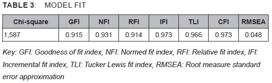 Prior to any analysis concerning the conceptual model, all constructs were checked for reliability through the Cronbach's alpha. As indicated in Table 2, all constructs were above the recommended 0.60 threshold necessary for reliability. Thereafter, model fit was checked, as indicated in Table 3, followed by the structural model in Figure 2. In order to test the proposed hypotheses, structural equation modeling was conducted in a two-part procedure, which involved assessing for model fit through confirmatory factor analysis (see Table 3 for results) and then the actual testing of hypotheses (see Figure 2 and Table 4 for results).