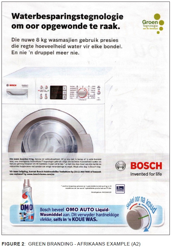 Banerjee et al. (1995: 22) conceptualise green advertising as any form of commercial communication that makes explicit or implicit statements about the impact of a product/service/organisation on the biophysical environment (cf. Nyilasy et al. 2014; Montage & Mukherjee 2010). Using this conceptualisation, the set of South African print advertisements was divided into two categories. Green branding designates green advertising for commercial brands, and it is distinguished from green washing on the grounds explicated in the next section. First, however, it is noted that green branding has become increasingly pivotal for fostering what Nyilasy et al. (2014: 694) call corporate social responsibility (CSR).