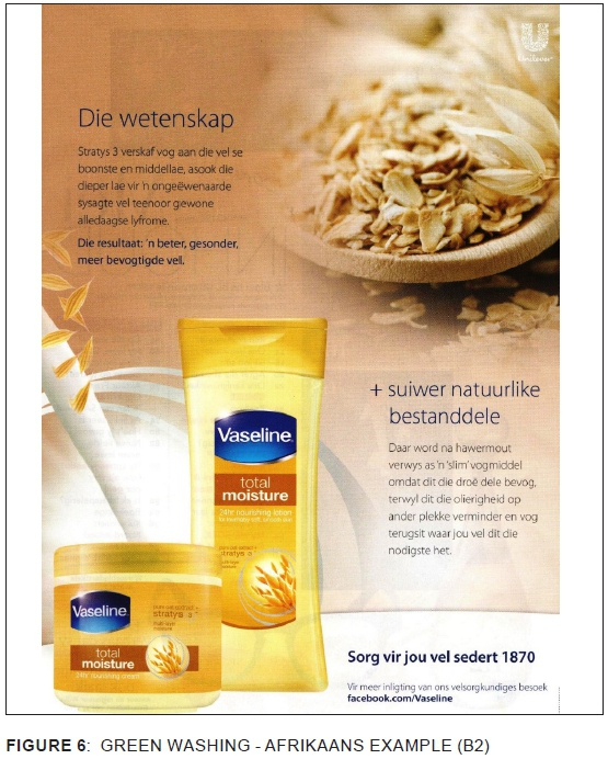 The green washing example by Cuticura (Figure 8) cream is indicative of this value attributed to the norm of being regarded as "green" and the fact that the ingredients of the brand are made from plant extracts are helpful in positioning this brand as "green" and therefore healthy and good for you and the environment. This example will also be classified as green washing since no proof is provided. Aspects such as beauty and physical appearance are of less importance in the positioning of the brand in this advertisement. This is evident in the visual choices (leave, colour, layout) and the lexical choices ("herbal", "restore", "natural", "life", "repair"), as was also illustrated in the complete analysis of the advertisements included in this investigation.
