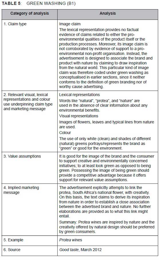 In the analysis that follows, the authors exemplify the application of Montage and Mukherjee (2010) and Fairclough (2003) by means of seven exemplars that illustrate this study's distinction between green washing and green branding. The analysis attends specifically to claim types (product, process and/or image) and value assumptions.