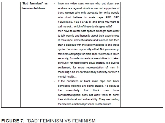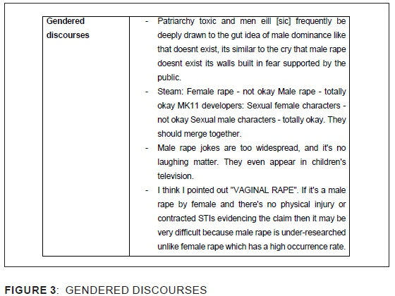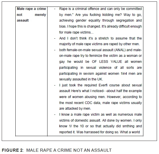 Alongside toxic masculinity lies the notion of feminism with related perceptions of females as victims of rape in society, while males are considered the perpetrators. The tweets demonstrate that discussions could have been silenced on the basis of the de-legitimation of male rape and the assertion that the perpetrators of female rape are always male. A comparison of rape statistics is used to delegitimise male rape, as "proof" of who the "real" victims of rape are - female victims with a much higher rate of reported cases. Online discussions on the observed shock of audiences to a male rape scene in a movie were mocked and trivialised in relation to the "everyday" experiences and fears of women of being raped. There was further risk attenuation of male rape, questioning why male-to-male rape was being discussed more than female-to-male rape in the results of the Twitter search. Conversants, some vicious in their discussions, noted that conversations about male rape only arise when female rape is mentioned.