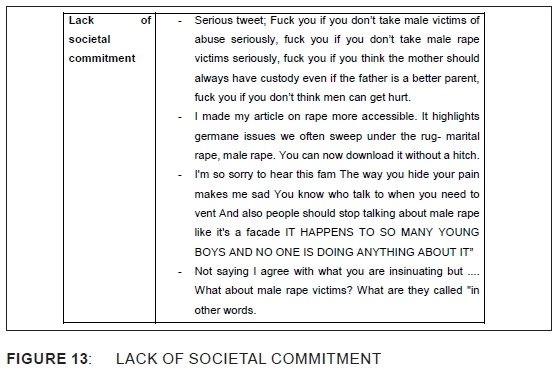 A total of 122 tweets were coded and analysed. The authors took cognisance of the fact that Twitter as an online tool, by limitation, allows a privileged few with access to online facilities to engage in conversations. Emergent themes were considered significant if two or more tweets carried similar sentiments with respect to an aspect of male rape, and these ranged from discussions to views. The most notable themes involved constant juxtaposition of male rape and female rape, as well as gendered stereotypes about males, including sexual orientation. Tweets referring to the sexual behaviour of men, as being responsible for them being raped, or the perceived lower risk of male rape compare to female rape, contributed to the risk attenuation of victims of male rape.