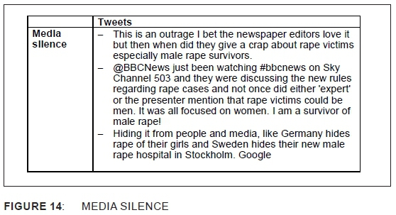 The media was blamed for focusing on female rape in their coverage, while disregarding stories about male rape. The tweets included accusations of the silence by the media about rape and an apparent agenda to keep conversations on rape focused only on women, to the exclusion of male rape. The media was also accused of deliberately hiding information from the public, and perpetuating a spiral of silence on issues of male rape, even when positive healthcare interventions for male rape victims, such as a dedicated hospital in Sweden, were introduced, which would be fodder for media coverage. The erasure of male rape from public discourses is blamed on the seeming lack of physical evidence of injury if female-to-male and the lack of research on the prevalence of male rape. This silence on male rape contributed to the risk attenuation of the issue in online discourses, where society is made immune to the risks through normalisation of certain risky behaviours in television programming. Most of the tweets centred on the passivity of society in acknowledging the risks of male rape, to the point of including it in children's programming, and the unemotional reports of its prevalence in films. The supporting evidence of the passivity was conversations on how the one male rape survivor, out of a number of female-to-male rape victims, was on the receiving end of harassment for reporting his experience.