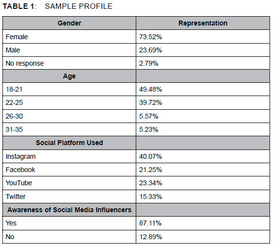 In terms of social media platforms listed, Instagram is the most used by the respondents, with a total of 40.07% (115 respondents). YouTube is the second most used platform (23.34%, 67 respondents). As the information in Table 1 indicates, 87.11% of the respondents have come across or know of an influencer.