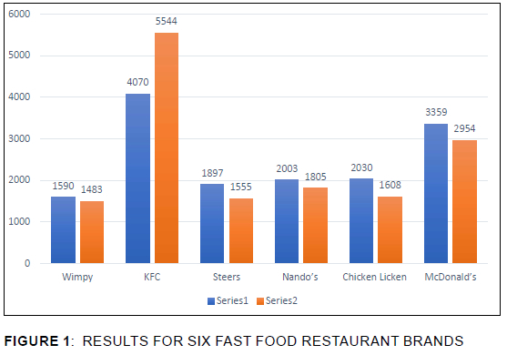 As a rule of thumb, the study ensured sufficient statistical power; the size of 30 to 40 participants per experimental condition seemed to be an adequate size, with a total number of 151 respondents (Geuens & De Pelsmacker 2017). The number of participants required was 105 to 220 participants, as per requirements related to the pairwise post hoc tests (Brysbaert 2019: 16). The results for six fast food restaurant brands are presented in Figure 1.