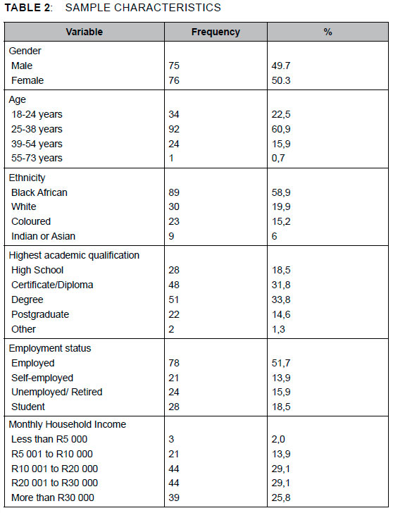 The researchers collected demographic profile information, including gender, age, ethnicity, education qualification, employment status, and family income. The proportions of males (49.7%) were almost the same as of females (50.3%). The sample was generally educated: most participants (65.6%) held a certificate or diploma, or undergraduate degree. This study also determined that nearly two-thirds of the respondents (65.6%) who participated in this study were employed. Lastly, more than three-quarters of the respondents had a gross monthly household income between R10 001 and R30 000 (58.2%) (see Table 2).