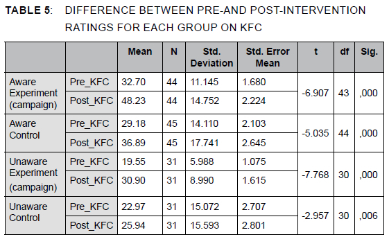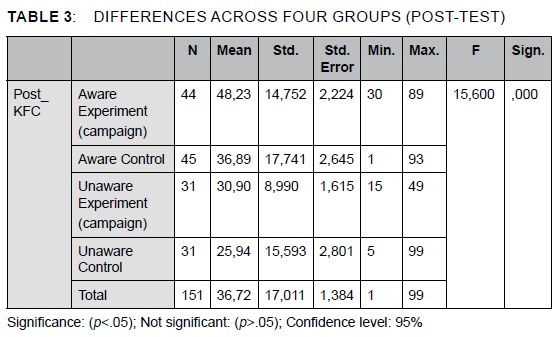 Post hoc tests revealed statistically significant differences across the four groups and how respondents rated KFC (aware experiment, n = 44: aware control, n = 45: unaware experiment, n = 31: unaware control, n = 31), X4 (4, n = 151) = 15,60, p = ,000 after the intervention) (see Table 3). The aware experiment group recorded a higher mean score (M = 48,23) than the other three groups, which recorded mean values of 36,89, 30,90 and 25,94.