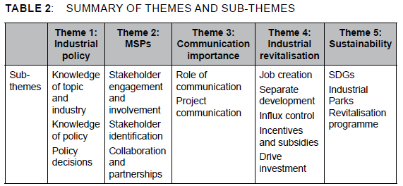 Five main themes with related sub-themes were constructed (see Table 2 below): industrial policy, MSPs, the importance of communication, industrial revitalisation, and sustainability.