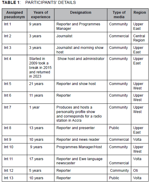 Interviewees were purposively selected based on Asuman and Moodley's (2023) finding that not many women are employed as radio journalists in rural and peri-urban Ghana. The selection criteria were that participants had to be female journalists who work in media outlets located in a rural or peri-urban area or region of Ghana. Rural and peri-urban media were operationalised as broadcast media outlets located in geographic areas that are located outside urban towns and cities. The economy of rural areas is typically agrarian and smaller compared with urban areas. The areas also have a low population density and small settlements. Community media tend to be in rural towns and formed part of the media outlets considered. A total of 13 participants were selected across 11 rural and peri-urban broadcast media outlets. The interviews were conducted over a two-month period; each interview lasted an average of 40 minutes. The interviews were conducted using the telephone and the videoconferencing application, Zoom. Table 1 provides a breakdown of the participants.