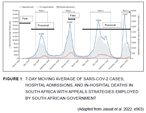 The SouthAfrican summer period, starting in November 2020, saw a gradual resurgence of COVID-19 infections, with the beginning of a second wave in December 2020. The government swiftly moved back to fear appeal messaging in their communication strategy to attempt to persuade citizens to change their behaviour immediately, with slogans such as Immediate behavioural change; Compulsory; Arrested for non-compliance with mask regulations. The fear appeal messages were employed from January to February 2021. The official end of the second wave brought about a change back to pro-social government messages for the remainder of the pandemic through the third and fourth wave, until the state of disaster was ended on 4 April 2022 (SA News 2022). The pro-social messages used from April 2021 to March 2022 included: