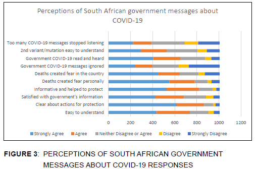 From 2020 to 2021, there appears to have been mixed perceptions towards the government's COVID-19 messages in the country, whose range is yet to be fully explored. From the current study, when the participants were asked about their perceptions about the South African government's messages on COVID-19,per Figure 2, the responses provided a mixed picture in response to the government's mixed appeals communication strategy. The three top perceptions towards the government messages that the participants strongly agreed to were: 1) clarity of government messaging enabling individuals to protect themselves and others, that is, pro-social. The participants were asked to rate on a scale of strongly disagree to strongly agree whether they perceived the government messages to the informative and whether they assisted them as individuals and others to protect themselves; 2) the second prominent perception was based on fear and was that daily provincial and national reports, especially those relating the number of people who nad died (COVID-19 mortalities), created fear in individuals. This response accrued from perceived severity which the EPPM identifies as audience perception towards the severity of the threat The participants were asked to rate a statement about whether the daily death reports created fear in them because they did not want to contract COVID-19; and, 3) a third dominant perception was pro-social with the participants stating that the messages were informative and helped them and others to protect themselves.