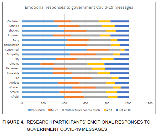 For the purposes of this study, the authors evaluated the responses on sources of COVID-19 information, perceptions, emotional responses, as well as behavioural intentions and changes based on the government's emotional appeals messages during the coronavirus pandemic. The data was used to evaluate the effectiveness of responsive messaging by health communicators, such as governments, to influence emotional outcomes and behavioural intentions during the COVID-19 pandemic based on lessons from the South African context. The data was analysed and is presented descriptively.
