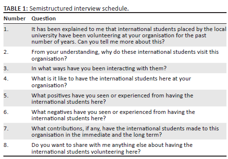 After giving informed consent, the participants were interviewed either at their workplaces or via an online platform (depending on the preference of the participant and considering Coronavirus Disease 2019 [COVID-19] protocols). Data were collected by fieldworkers who have no interest in the service-learning programme, because the existing relationships between the stakeholders might inhibit honest and critical reflections when interviews were conducted between people who were known to one another. The field workers underwent extensive training, preparation and practise of the interviewing process, and a pilot study confirmed the appropriateness of the interview schedule (please see the schedule in Table 1). Each interview took between 30 min and 60 min to complete. Afterwards, the fieldworkers reflected that the interviews that had been conducted with care workers and volunteers via an online platform generally had yielded less rich data than face-to-face interviews, possibly because the care workers and volunteers as participants were unfamiliar with online interviews.