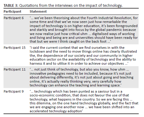 Understanding the impact of technology, as well as the role of innovation in this process of technology adoption, will allow South African HEIs to better prepare themselves and to serve its social obligations more effectively, as the opposite may render an institution irrelevant as the world continues to move down a trajectory dictated by technology and 4IR.47 Refer to Table 3 for excerpts from the interviews.