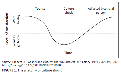 The period of cultural confusion and social disorientation, or what Alves López and Peña Portero have termed rejection and regression, is termed cultural shock which can overwhelm the newcomer with feelings of disengagement, and the need to go home.49 On the other hand, should the newcomer resist the urge to abscond, completes the process of negotiation and adjustment,49 she or he gets acculturated and becomes and a bicultural person - who has become well-adjusted to the new culture and functions with similar efficacy as she would under own culture.48 This is usually achieved as a result of establishing social ties and functional familiarity with new institutions that allow one to function effectively. In explaining this concept, Hiebert employs the diagram in Figure 1.