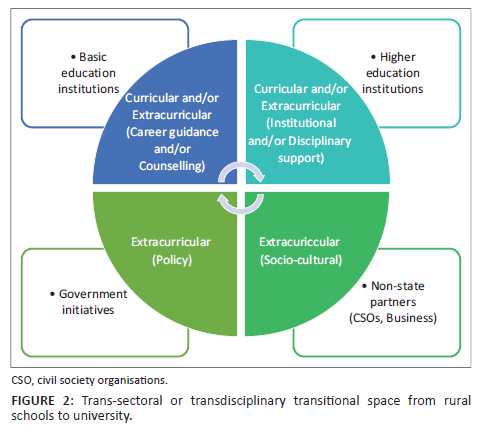 This article recommends that their activities be incorporated into the mainstream transitional intervention and made accessible to every learner or student. In addition, CSO is also well-positioned to engage local communities in order to assist the development of effective socio-cultural capital for rural learners. Corporate organisations are always peripheral in the educational process, only limiting their corporate social responsibility to funding modalities (for infrastructure development, human capital and human resources). In this way, they remain inconspicuous of the everyday activities of education. The researchers suggest that CSOs can be conspicuously engaged in the transition of rural students from schools to universities. For example, receptacles of the world of work, and their involvement in career guidance forums will be very instrumental and informative, as they have relevant information on current labour practices. Their corporate social responsibility could also involve extending mentorship programmes to rural learners, which will be instrumental in the development of relevant socio-cultural capital needed in the contemporary world of work. In order to breach the gap created in the current transition practices, because of haphazard and discretionary programming and intervention, we suggest this multilevel (curricular or extracurricular) trans-sectoral (education, government policy and non-state) and transdisciplinary (learning sciences, development sciences and HE) space transition from school to university.